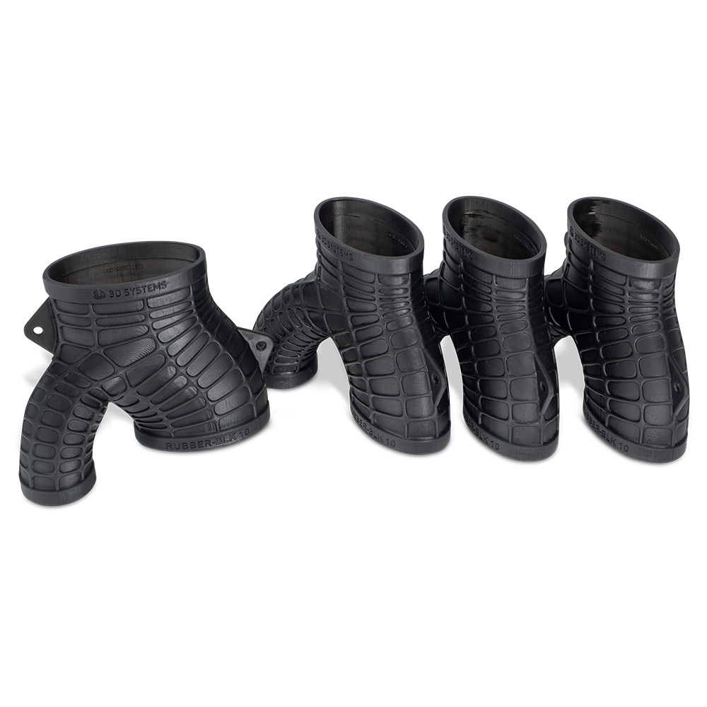 Figure 4 RUBBER-BLK 10 is a high tear strength material for the production of hard rubber-like parts with slow-rebound for touch applications such as grips, handles and bumpers, as well as strain-relief applications, couplings, over molds, etc. This extremely tough material has an exceptional surface finish and long-term environmental stability.